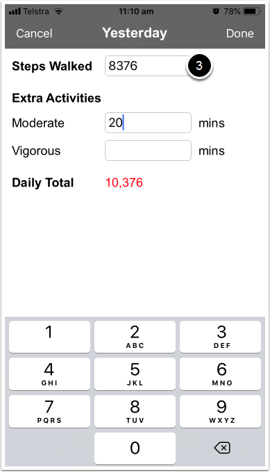 Enter the number of steps you have walked and any time in minutes in the moderate and or vigorous activity fields. Select Done when you are finished. Repeat this for additional days.